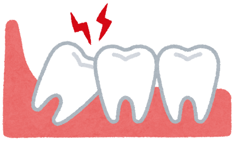 親知らずが斜めや横を向いている場合、手前の歯を圧迫して歯並びが変わることがあります。